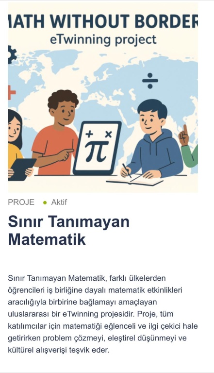 Okulumuz, eğitimde sınırları ortadan kaldıran yenilikçi bir projeye daha imza atıyor. Matematik öğretmenimiz Özlem Çağın DEMİRCİ'nin rehberliğinde hayata geçirilen "Sınır Tanımayan Matematik (Math Without Borders)" adlı uluslararası eTwinning projesi, öğrencilerimize yepyeni ufuklar açmaya hazırlanıyor.